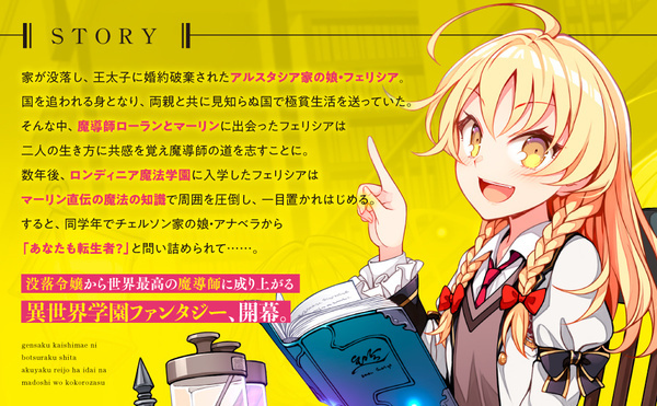 王太子に婚約破棄され没落したアルスタシア家の娘・フェリシア。国を追われる身となり、両親と共に見知らぬ国で極貧生活の日々を送っていた。そんな中、魔導師ローランとマーリンに出会ったフェリシアは二人の生き方に共感を覚え魔導師の道を志すことに。数年後、ロンディニア魔法学園に入学したフェリシアはマーリン直伝の魔法の知識で周囲を圧倒し一目置かれはじめる。すると、同学年でチェルソン家の娘・アナベラから「あなたも転生者?」と問い詰められて……。没落令嬢から世界最高の魔導師に成り上がる異世界学園ファンタジー、開幕。
