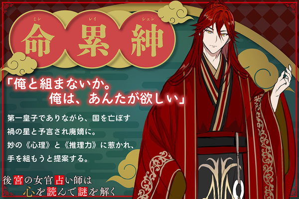 ある日、妃妾たちに占いを披露していると、見目麗しい男から「俺の素性を当てられたら大月餅をやる」と持ちかけられ、第一皇子の命累紳であることを言い当てる。